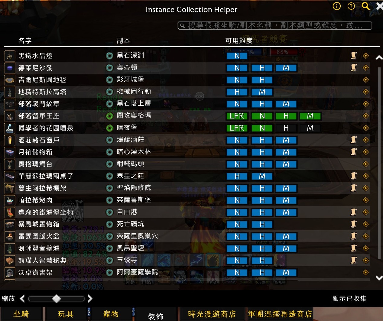 介面截圖為勾選顯示已擁有坐騎(預設不勾只是演示),已擁有顯示為綠色,已刷難度顯示為黑底。